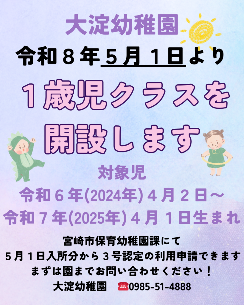 この度、令和8年度5月1日より認可され、大淀幼稚園1歳児クラスを開設することになりました。